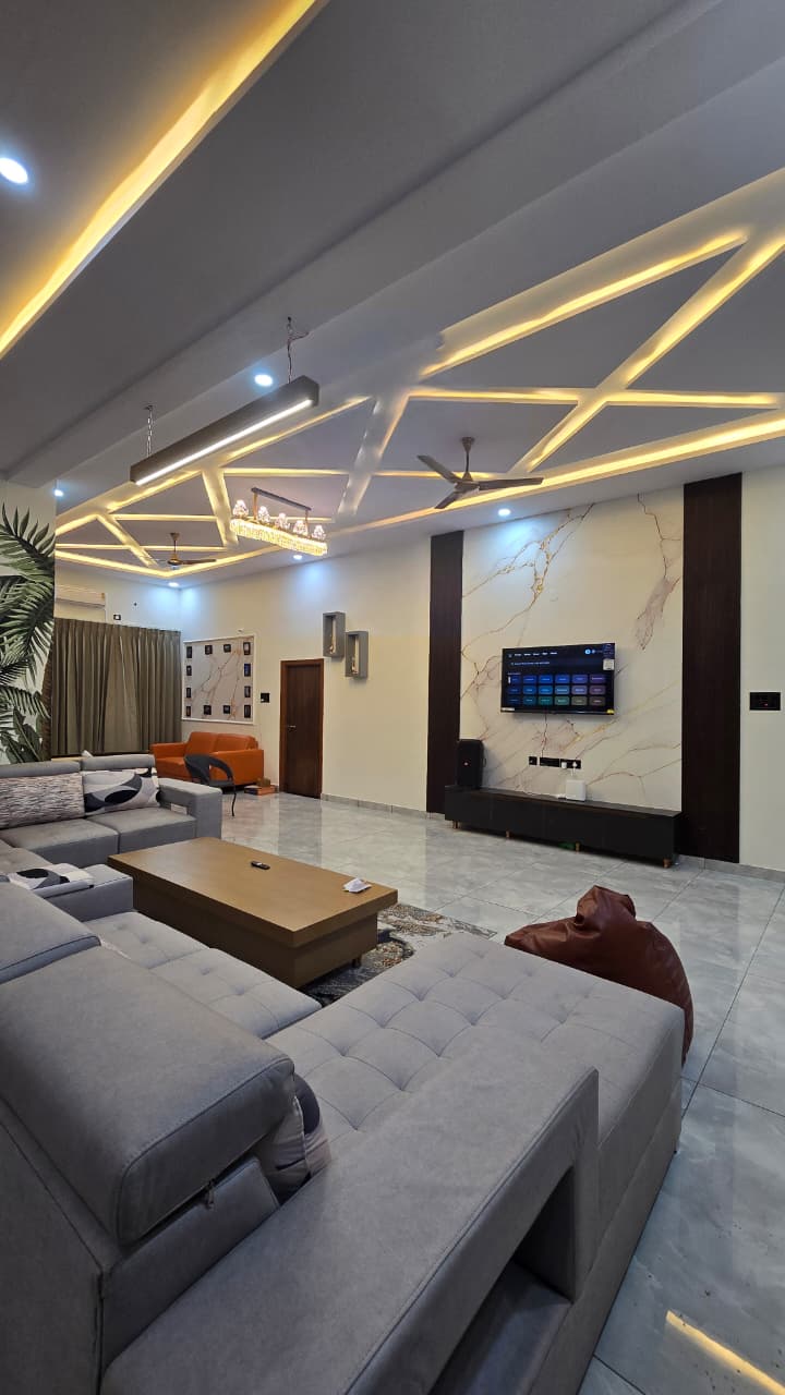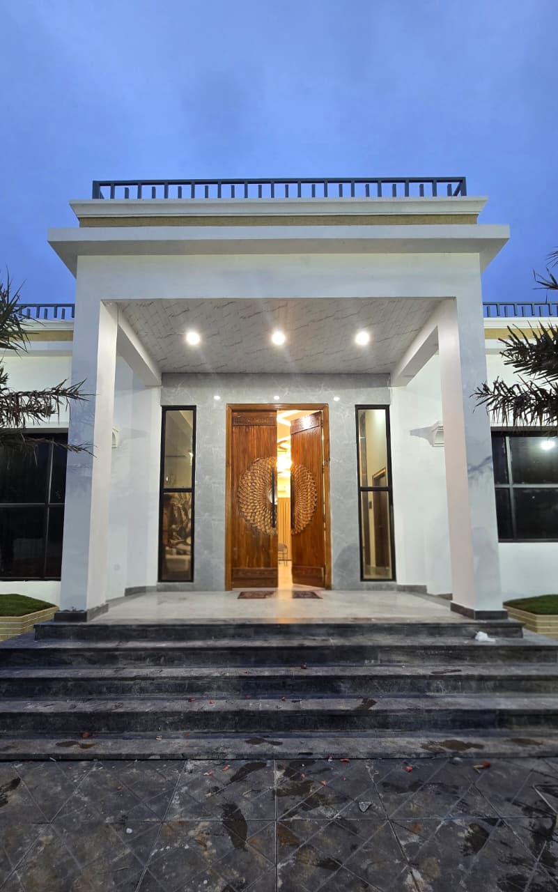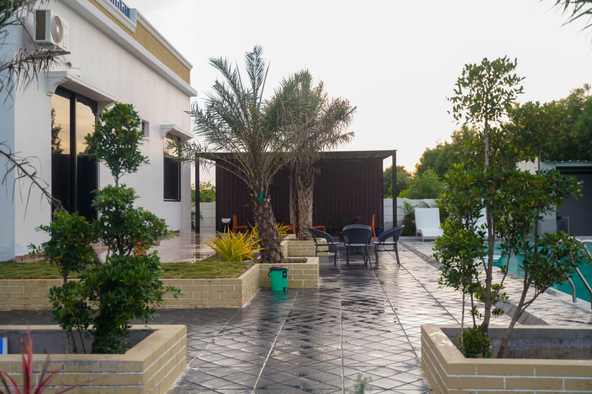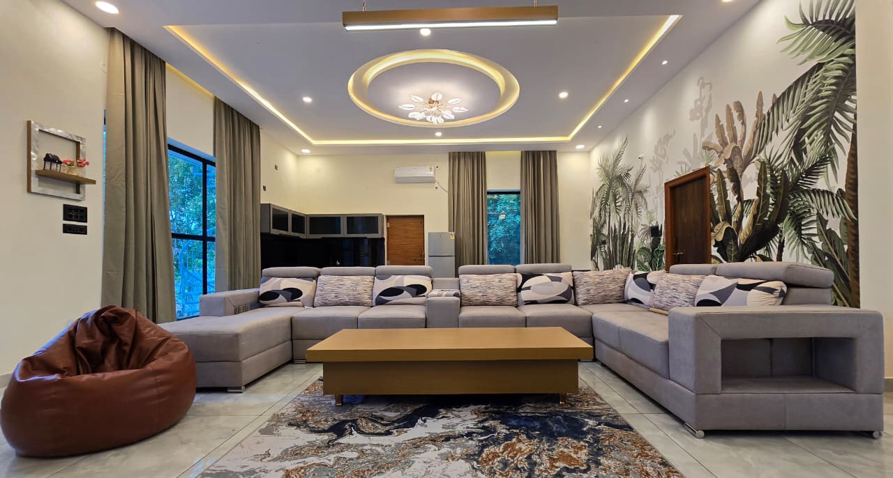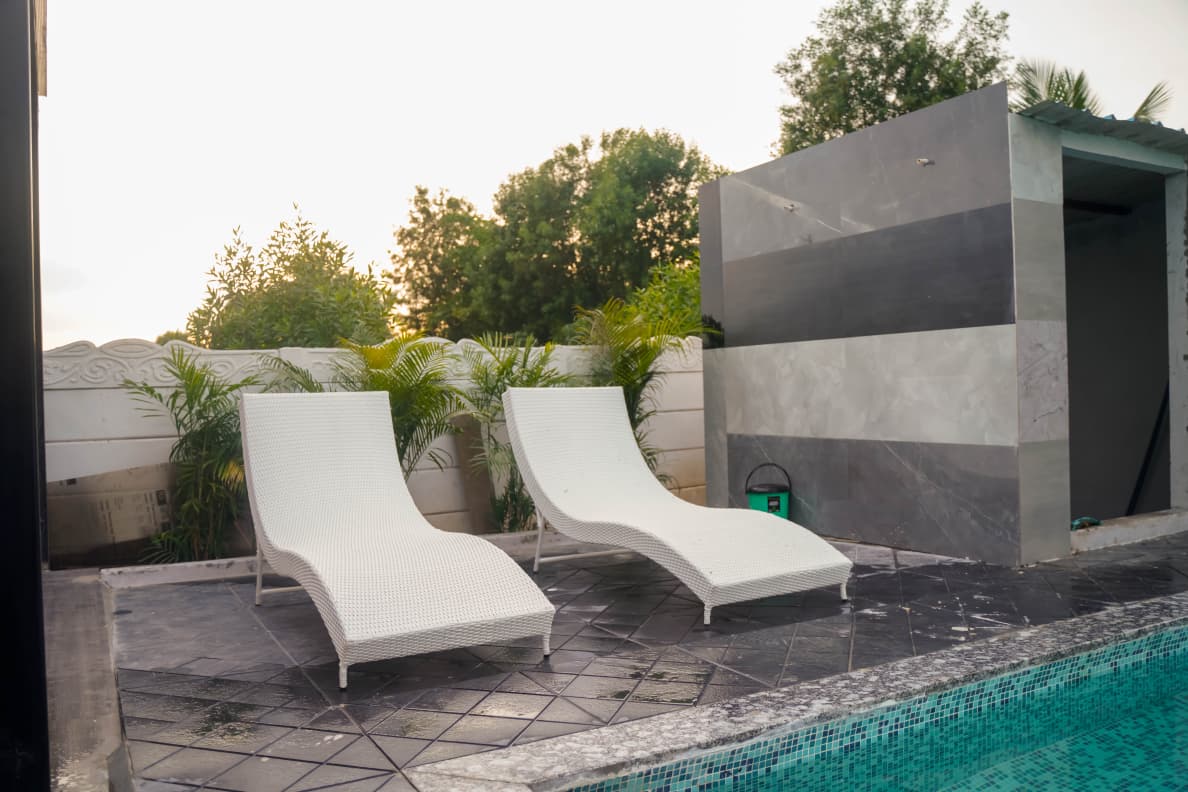 The crown of the outdoor space is the private swimming pool — open, well-maintained, and surrounded by enough room for sunbathing, poolside seating, and impromptu pool parties. Just beyond, the sprawling green lawn is a blank canvas for birthday setups, group activities, photography, or simply stargazing in the evening. The dedicated sit-out area adds an extra layer of comfort — imagine your morning chai or late-night conversations here, with nothing but the sound of nature around you.